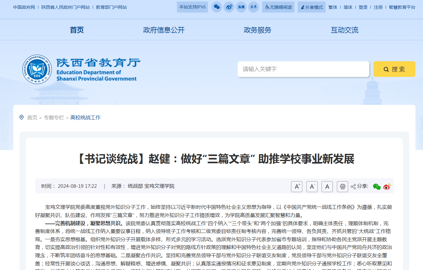 宝鸡文理学院党委高度重视党外知识分子工作,始终坚持以习近平新时代中国特色社会主义思想为指导,以《中国共产党统一战线工作条例》为遵循,扎实做好凝聚共识、队伍建设、作用发挥“三篇文章”,努力推进党外知识分子工作提质增效,为学院高质量发展汇聚智慧和力量。